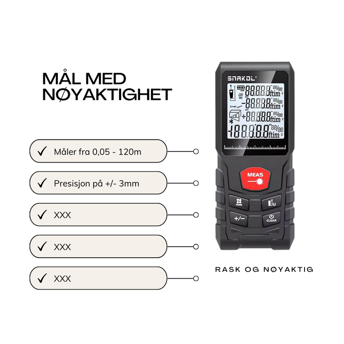 📏 Fleksibelt Måleområde: Mål avstander fra 0,05M til 120M.
